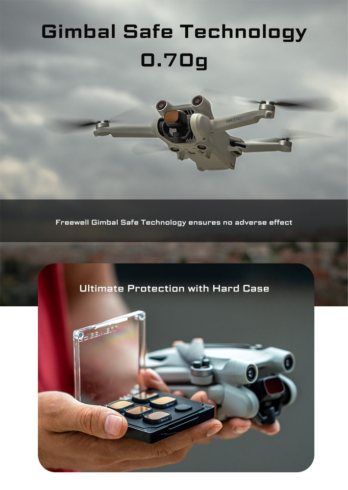 - GimbalSafe: Die Freewell GimbalSafe-Technologie stellt sicher, dass jeder Filterrahmen einen strengen Leichtgewichtstest durchläuft, ohne dass Ihr Drohnen-Gimbal beeinträchtigt wird.