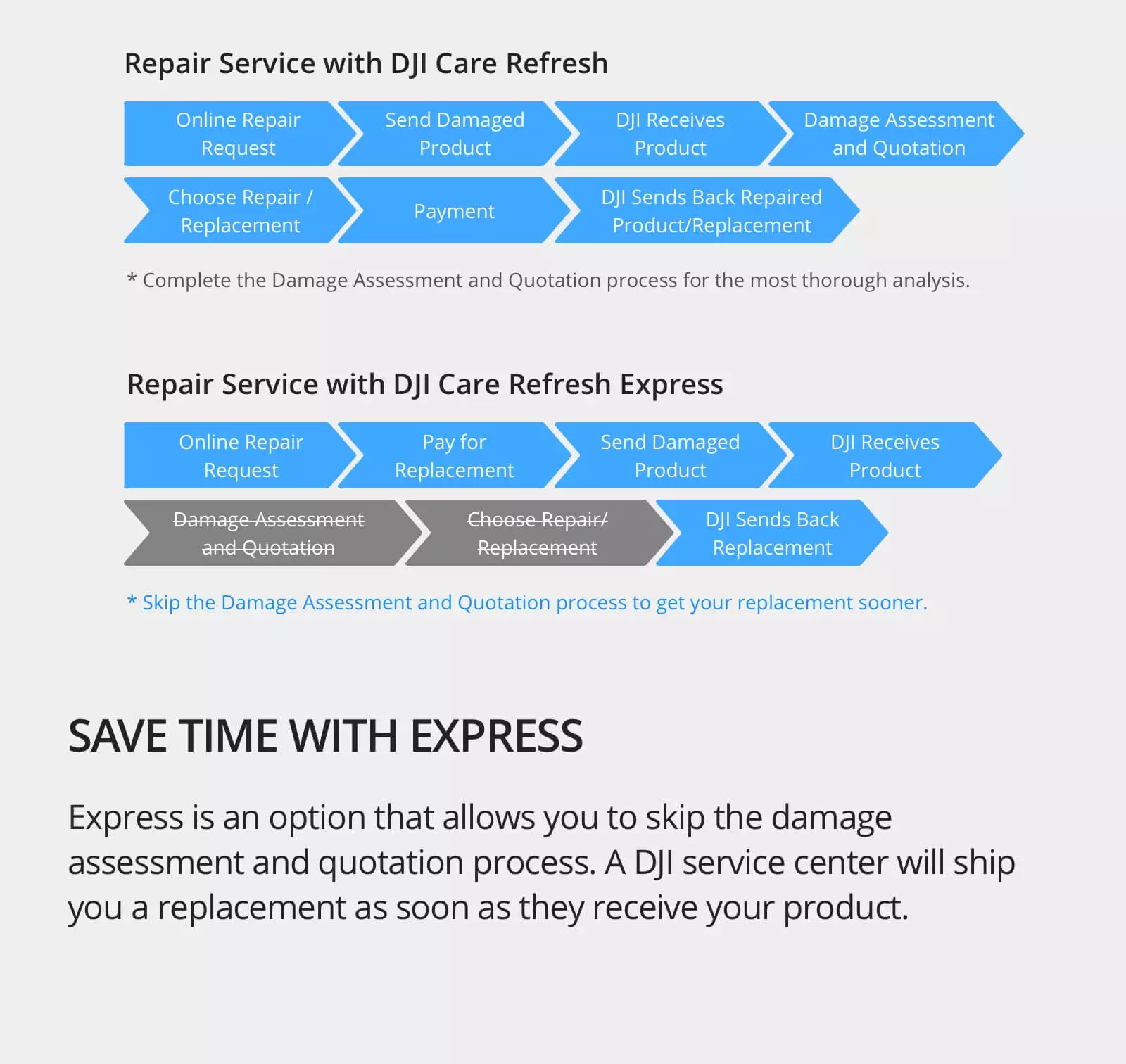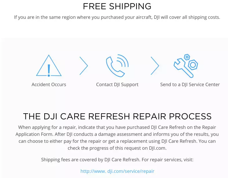 Sie zahlen zunächst für den Care Refresh-Service. Sie zahlen dann einen festen, geringen Betrag pro Absturz, um den gesamten Schaden zu decken, und die Drohne wird in der Regel ersetzt. Das bedeutet, dass es sich bei der zurückerhaltenen Drohne häufig um eine andere Drohne mit einer anderen Seriennummer handelt. Dies kann dazu führen, dass Sie erneut Genehmigungen beantragen oder Verwaltungsgebühren zahlen müssen, um die Seriennummer zu ändern. Die Abholung und Rückgabe der Drohne ist kostenlos (im Land des Kaufs).
